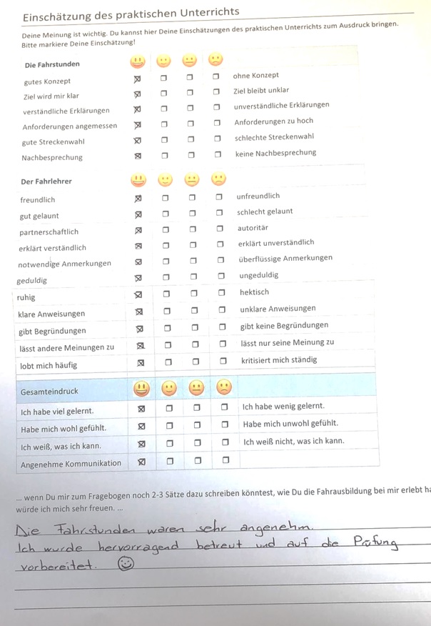 Die Fahrstunden waren sehr angenehm. Ich wurde hervorragend betreut und auf die Prüfung vorbereitet.